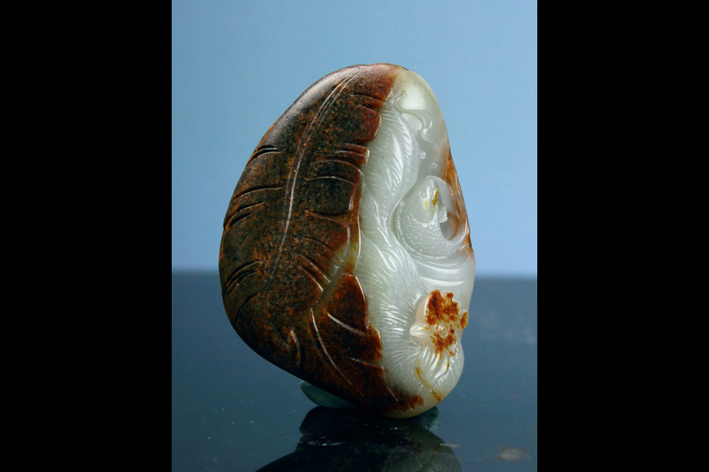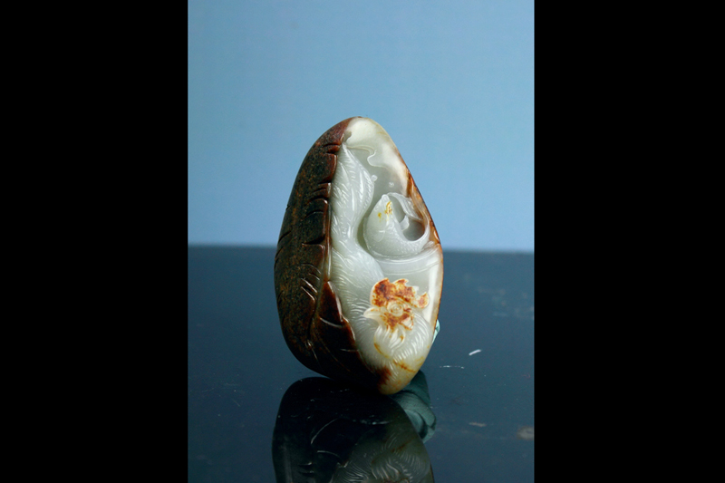 朋友淘了个满皮子的料.肉青点,但料老气.细度还不错.于是拿来想做个作品出来,所以拿到手后,找露肉处入手,用点红皮巧做大公鸡的鸡冠,大公鸡身后做只水缸.里面一条鱼儿在水里翻腾,鸡和鱼,取其谐音"机遇".也算是件有趣的作品,背后没毛病,所以就不去动它了,保留其完整性,作品完工后定名为__机遇.
