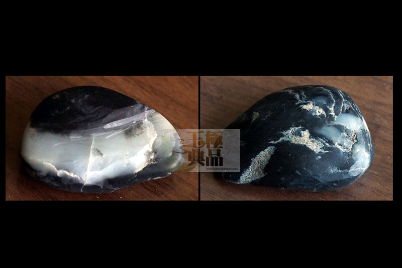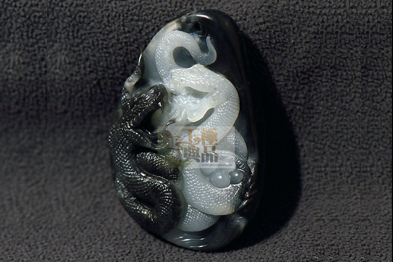 客户送来一个青花,黑白较分明,但裂多,客户想做个蛇的题材,因此接手后,先挖脏去裂。磨顺后,即投入设计阶段,根据料子黑白分明的特点,极品玉典决定正面做一黑一白两条蛇,两头相对。细长的舌信互相缠绕在一起,似在接吻。爱意绵绵,白蛇盘曲的身体,紧紧护住几个蛋,体现出强烈的母爱。原料背面裂相对少些,所以做点碎石,一些僵斑做点野草借之,一点白肉巧做成溪流,静静地流淌着。作品采用了写实再加点拟人化的表现手法,充分表现了夫妻之间的恩爱以及母性的伟大。作品完工后定名为———如胶似漆。