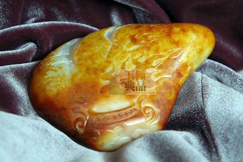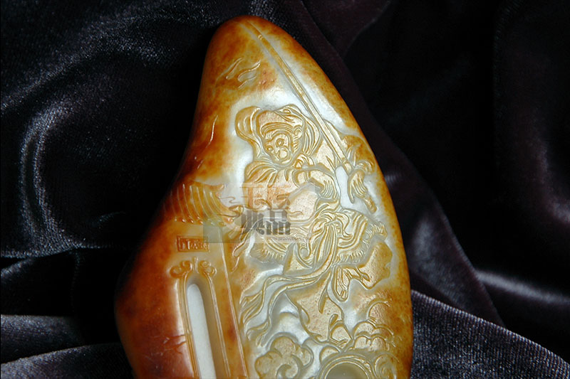 朋友送来的一个料,已被挖开三个口子,而且口子形状各异,不是很好弄,考虑到皮色较薄,不能深做,因此作很浅的浮雕,正面做孙悟空,脚踏筋斗云,反出南天门,挖开的一条长口子,巧作南天门的门洞,另一个圆洞做被踢翻的酒坛的口。背面挖开的口,做倒塌的老君的炼丹炉,炉火雄雄燃烧。另一边露出的白肉,做天兵天将的军旗。远远追来。把(西游记)中孙悟空大闹天宫这一段表现得淋漓尽致,作品完工后命名为——大闹天宫。