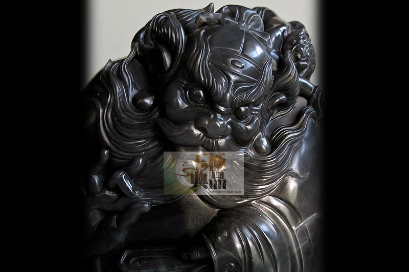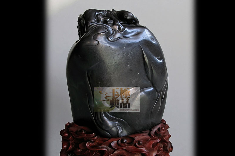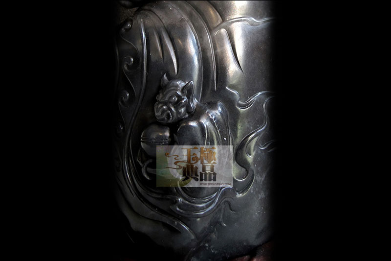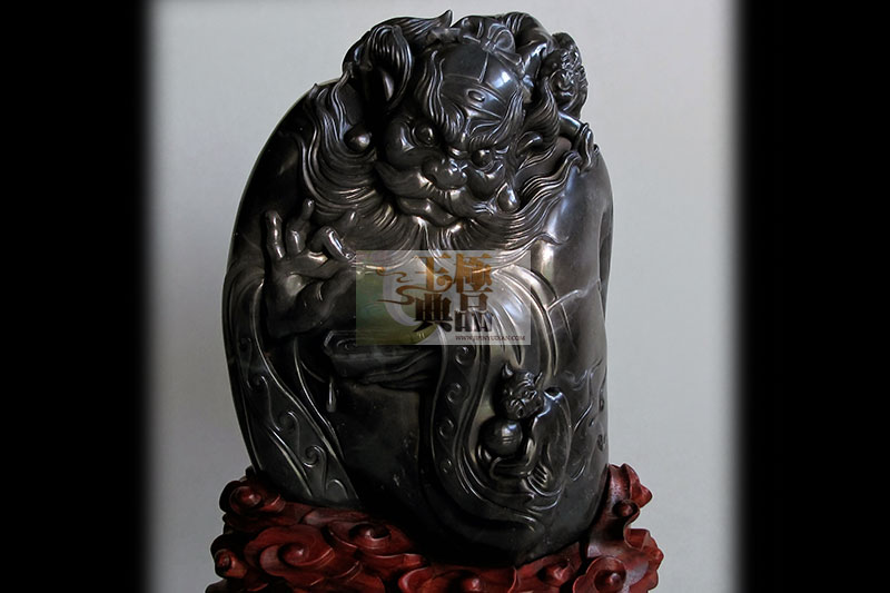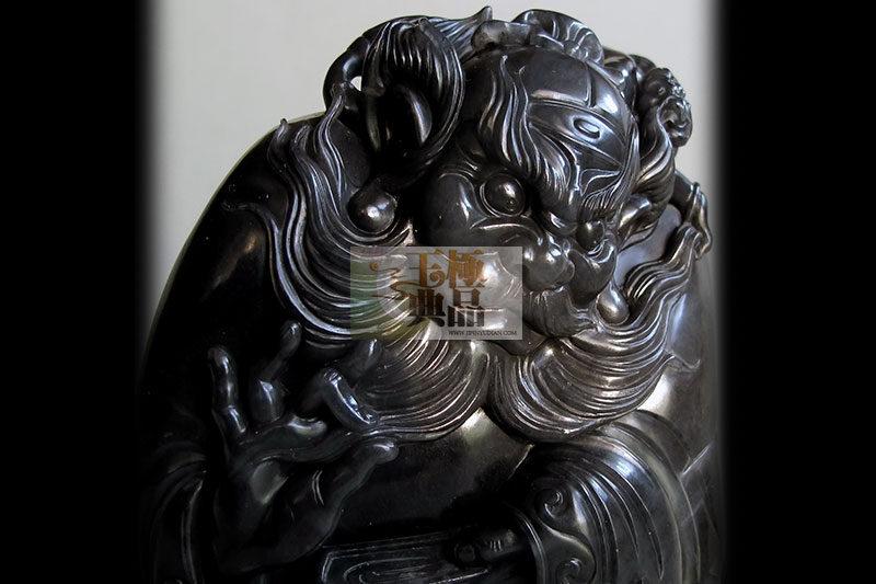 原料重达2斤,青花籽.油性不错,客户想做个钟馗题材,因此,把料简单切磨后,按型,做钟馗,手拿酒杯,双目圆睁,低头俯视小鬼,而小鬼手捧食盒,小心翼翼站在一旁服伺,钟馗脖子后爬一小鬼,正殷勤地替主人梳理毛发,整件作品,突出表现了钟馗的脸部表情,以及身体动态,肌肉的穿插.写实中带点夸张,作品完工后定名为____钟馗醉酒!
