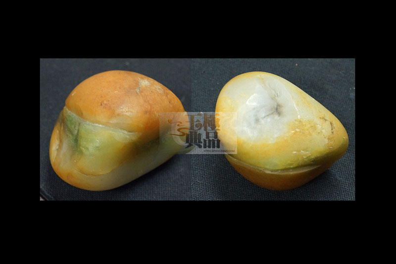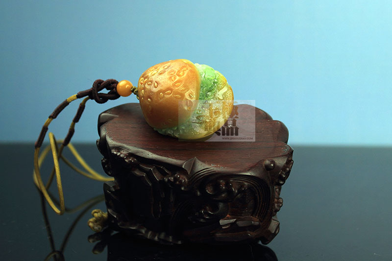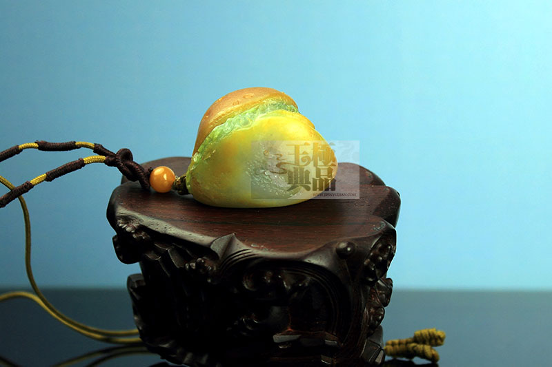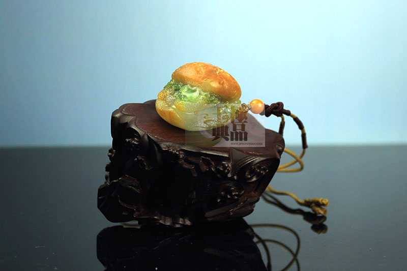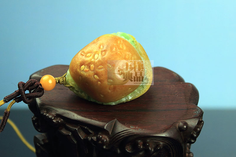 为圈内一同行朋友设计制作,料子正面带黄僵,料当中部分有一片很艳的翠绿色,这在和田玉中算很少见,底下有肉,挺细腻的,这是个巧作的好材料,拿到手后,极品玉典多方揣摩,仔细比较,最后决定做一只刚出炉的新鲜汉堡包,面包上撒满了芝麻。当中的翠绿,巧做成夹在汉堡中的生菜叶,翻卷着,呈现出一种自然的形态,生菜边上的白肉处,做剥开面包外皮后里面蓬松的气孔,还做了点流淌地肉汁,整件作品,真实中带着点俏皮,小巧玲珑。色彩分明。生菜取其谐音“生财”,所以作品完工后定名为——生财宝。
