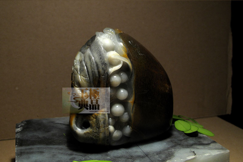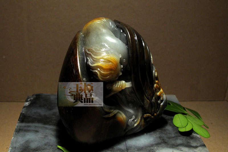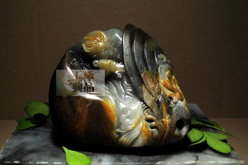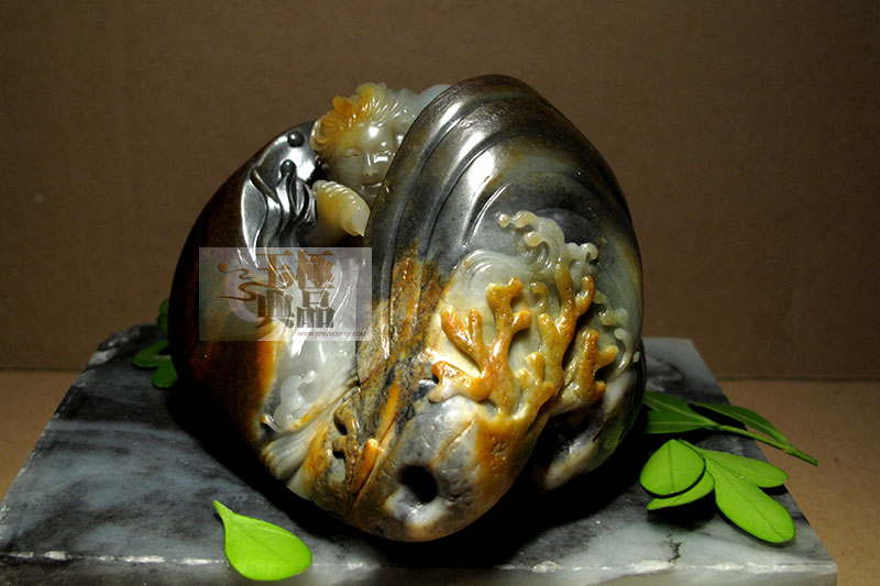 客人送来一个青花籽,个有近拳头大小。想请极品玉典设计一件有想法的作品出来,接料后,考虑到料子当中有肉,两侧有僵的特点,极品玉典忽然想起一个成语“剖蚌求珠”,感觉可以出效果,于是马上动手画稿,先用当中的肉画一体格健壮。肤色黝黑的渔夫,手拿利刃,一头扎入海中,潜入海底,用匕首插进一个黑色的大蚌里,正用力撬开,蚌里成堆的珍珠纷纷散落出来。水里水草随波飘动,渔夫嘴里也吐出一个个气泡,突出了临场感,蚌壳边上的僵设计了珊瑚,以及翻卷而来的水浪,考虑到料子个大,携带不方便的情况,整个设计还是以摆件为主,但依然留了穿绳的位置。作品经过细细地雕琢。逐步呈现出较强的立体感,完工后请打磨好手精细地打磨,把玉质的油润度全打出来了,全身泛出柔和的光泽来,成品基本达到了设计的预想效果。