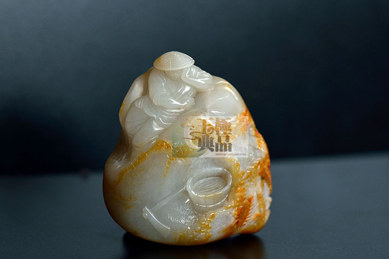 朋友的一个巴掌大的原料。表面裂痕多,纵横交错,皮色分布散乱,朋友感觉不好出东西,很是头疼,拿来找我商量,看看能不能做,也是想了许久,最后细细推敲,根据皮色散乱的特点,以及挖裂去脏后的形状,决定用做农田,皮色做成田埂,最好的一块肉做一农夫,头戴斗笠,悠闲地靠在农田边的石头上打盹,农田里禾苗茂密,边上的红皮做成群的稻穗,颗粒饱满,即将到了收获的季节,田间一处挖过的凹陷,巧做浇水的木桶一只,边上放着一把锄头。背后做田边的碎石,一条小溪从石缝之间流过,两条小鱼跃出水面嬉戏着,打破了画面上宁静的气氛。体现了静中有动的感觉。作品完工后请打磨细细打顺,成品与原料比变化还是挺大的,朋友很是开心.