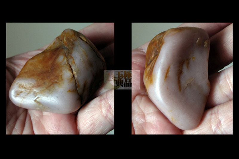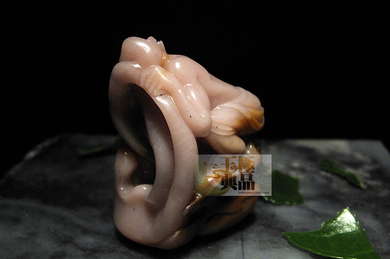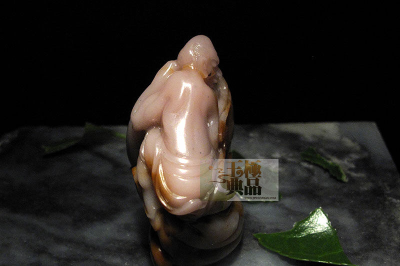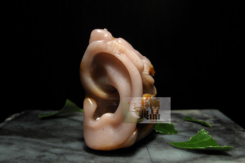 朋友送来的一个料子,跟(肥猪满圈)系同一种料,粉红色。脂感不错,上面还带有点红的僵皮,个不大,50多克的样子,朋友想出个与众不同的作品,所以请极品玉典代为操刀,根据料子的特点,极品玉典准备了一个很大胆的设计。决定做神话里的人物——顺风耳,他侧着头用左耳很专注地在伶听天地之间的微小声音,左耳被夸张性地做得很大,努力表现出顺风耳的特点就在于灵敏的听觉!顺风耳全身被红色的祥云所围绕,整件作品用了写实的表现手法。充分利用了料子的色和质感。完工后定名为————顺风耳。