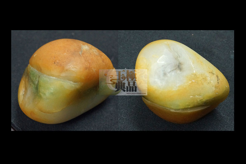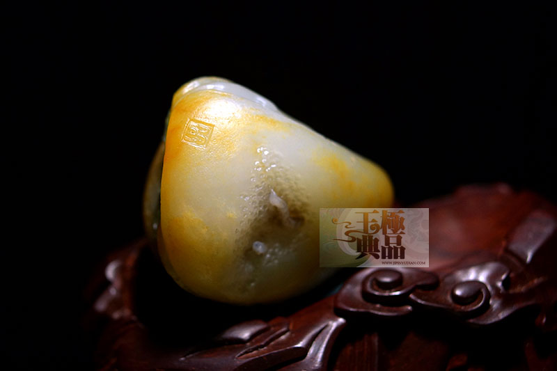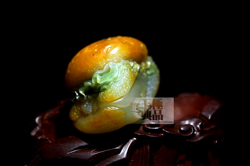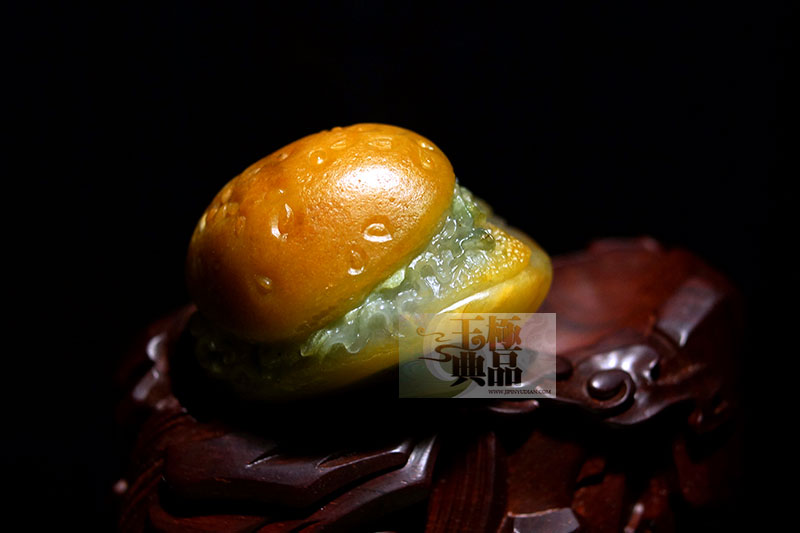 为圈内一同行朋友设计制作,料子正面带黄僵,料当中部分有一片很艳的翠绿色,这在和田玉中算很少见,底下有肉,挺细腻的,这是个巧作的好材料,拿到手后,极品玉典多方揣摩,仔细比较,最后决定做一只刚出炉的新鲜汉堡包,面包上撒满了芝麻。当中的翠绿,巧做成夹在汉堡中的生菜叶,翻卷着,呈现出一种自然的形态,生菜边上的白肉处,做剥开面包外皮后里面蓬松的气孔,还做了点流淌地肉汁,整件作品,真实中带着点俏皮,小巧玲珑。色彩分明。生菜取其谐音“生财”,所以作品完工后定名为——生财宝。