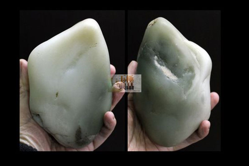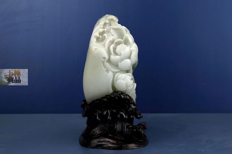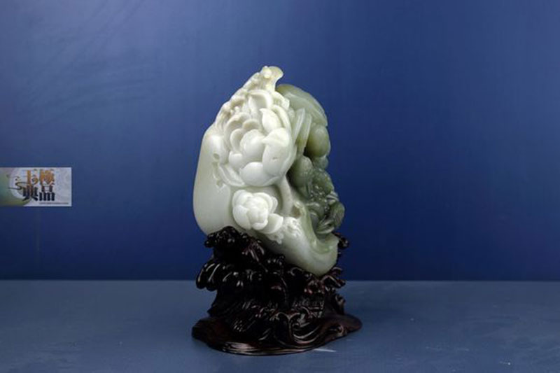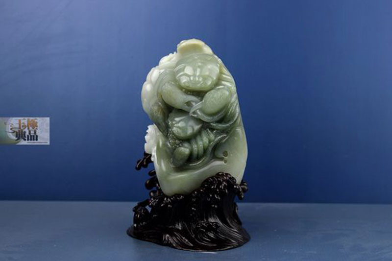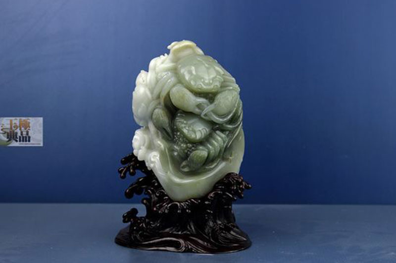 朋友送来的一个拳头大的料子,带一大片淡青色。白肉里穿有大片的纯白色僵,僵沁入很深,无法去除,朋友想做个摆件,于是入手后就进行设计。根据料子的具体情况,决定用青色做两只大闸蟹,攀爬在一起,亲密无间。厚厚的白僵,巧做盛开的莲花,丰润柔美,迎风绽放。当中伴以水浪和荷叶,作品采用了写实的表现手法,充分利用了原料的特点,巧色运用浑然天成。荷叶谐音“和”字。蟹谐音“谐”字。因此作品完工后定名为——和谐相处。同时应朋友的要求,又加配了底座。使作品看上去更加完整大气。